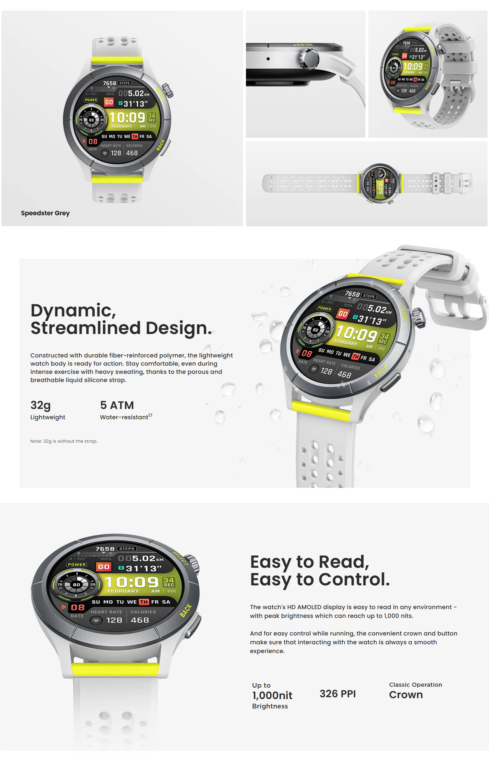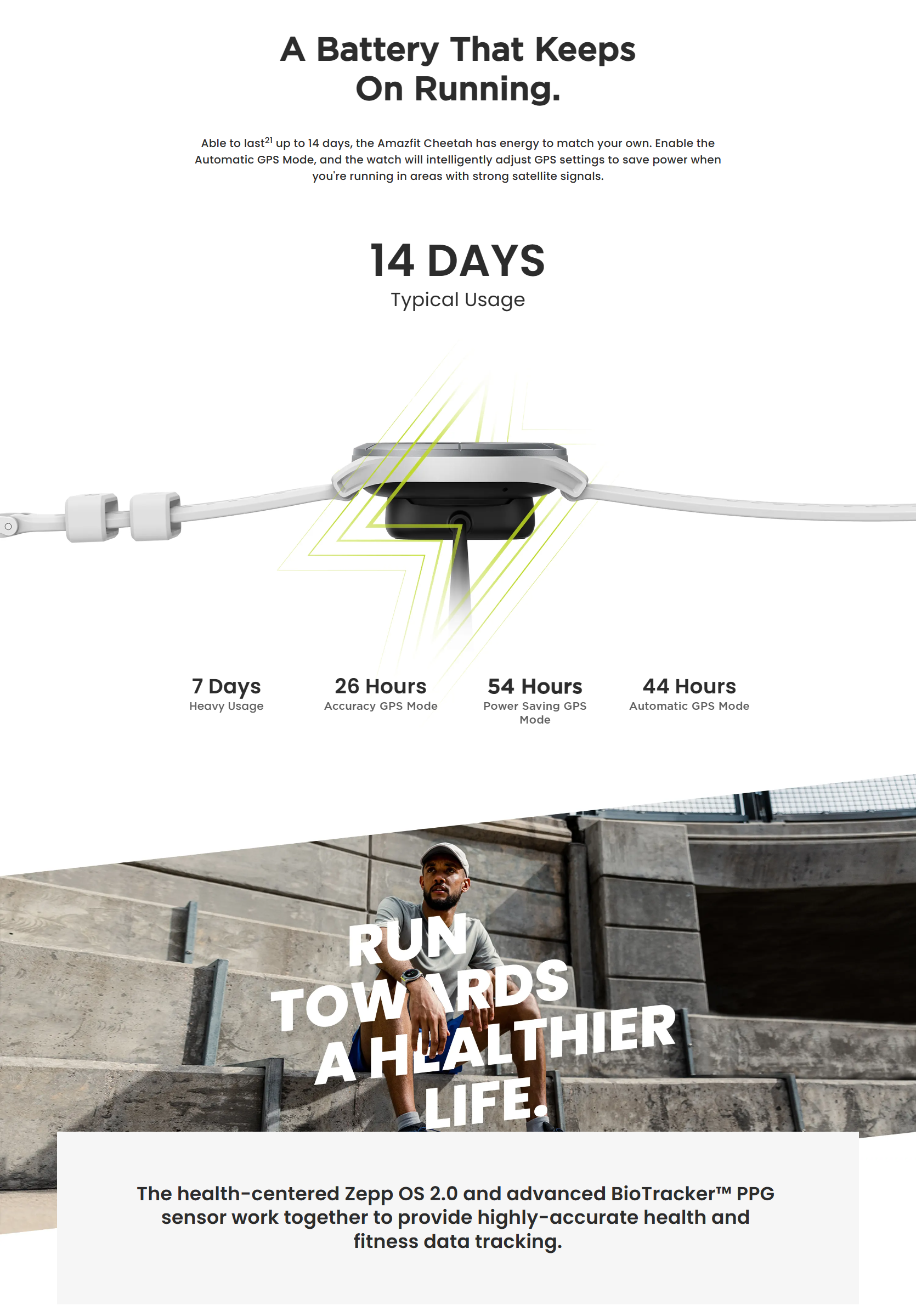 The Amazfit Cheetah can pick up L1 and L5 satellite signals for pinpoint dual-band GPS tracking, and supports six satellite positioning systems for reliable coverage2. We’ve got you covered, wherever you like to run.