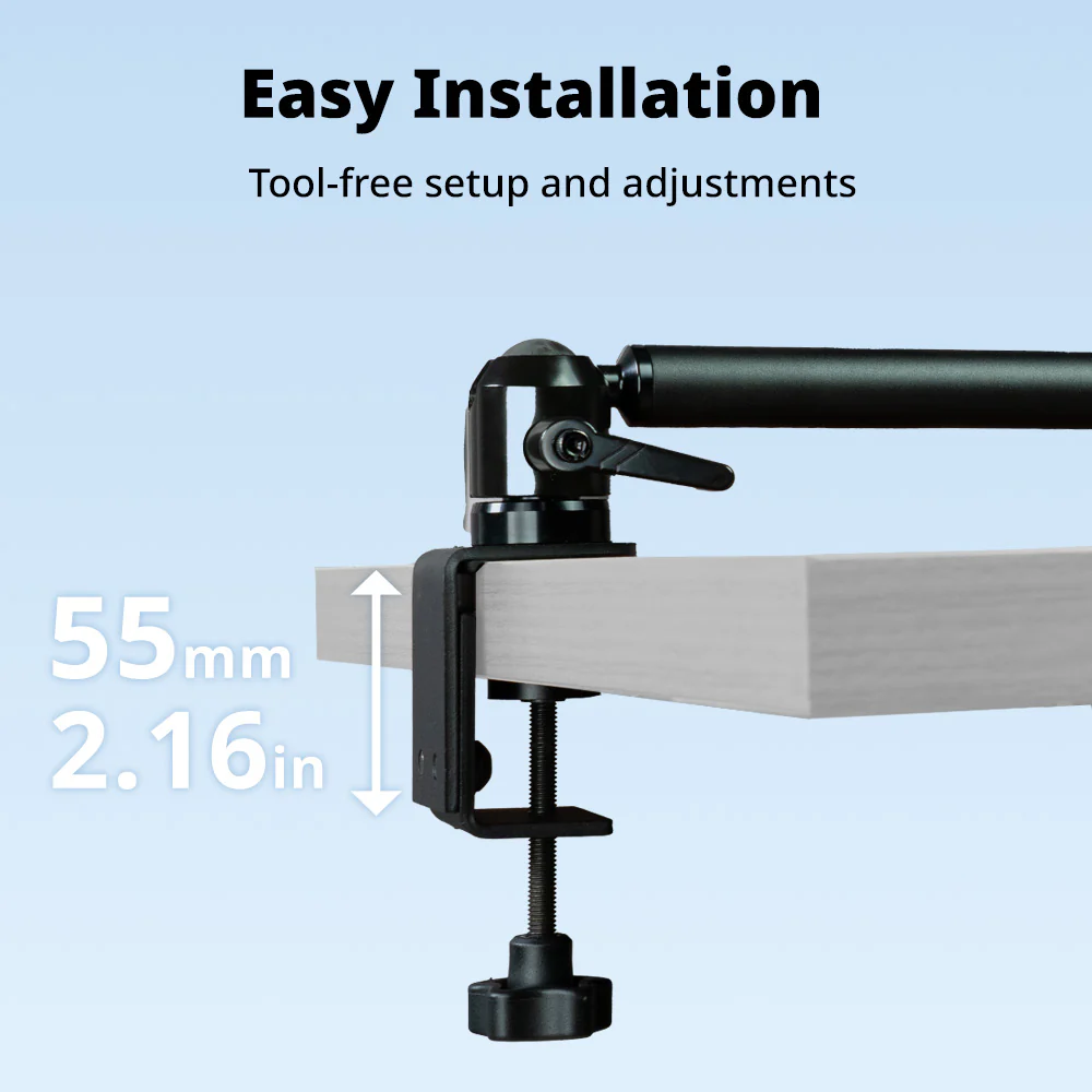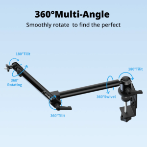 ข้อต่อด้านบนสามารถหมุนแนวนอนได้ 360° และเอียงในแนวตั้งได้ 180° เพื่อให้ได้มุมที่เหมาะสมที่สุดในทุกสถานการณ์ ช่วยให้ไมโครโฟนหรือกล้องของคุณอยู่ในตำแหน่งที่สมบูรณ์แบบเสมอ
