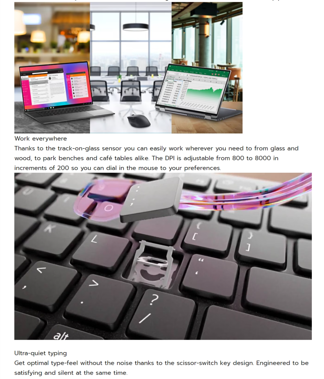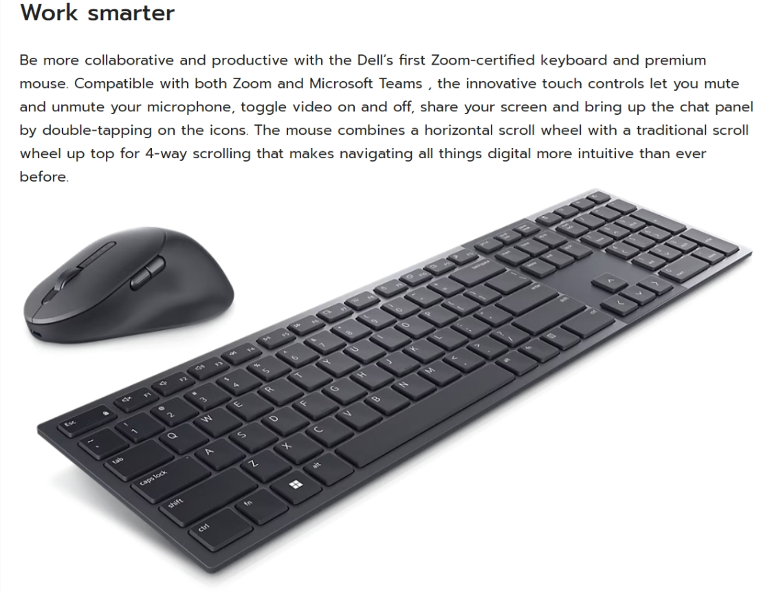 Be more collaborative and productive with the Dell’s first Zoom-certified keyboard and premium mouse. Compatible with both Zoom and Microsoft Teams , the innovative touch controls let you mute and unmute your microphone, toggle video on and off, share your screen and bring up the chat panel by double-tapping on the icons. The mouse combines a horizontal scroll wheel with a traditional scroll wheel up top for 4-way scrolling that makes navigating all things digital more intuitive than ever before.