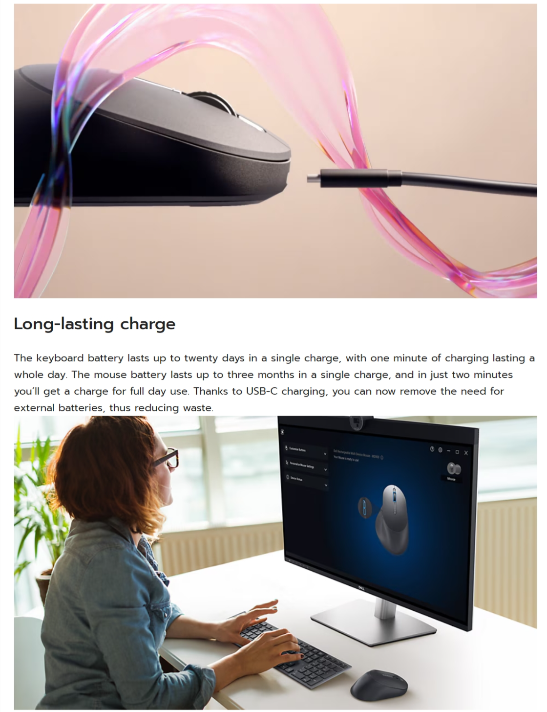 The keyboard battery lasts up to twenty days in a single charge, with one minute of charging lasting a whole day. The mouse battery lasts up to three months in a single charge, and in just two minutes you’ll get a charge for full day use. Thanks to USB-C charging, you can now remove the need for external batteries, thus reducing waste.