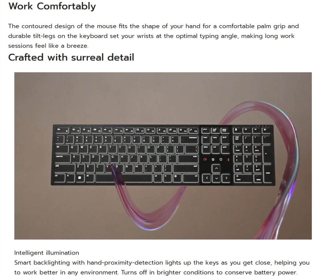 The contoured design of the mouse fits the shape of your hand for a comfortable palm grip and durable tilt-legs on the keyboard set your wrists at the optimal typing angle, making long work sessions feel like a breeze.