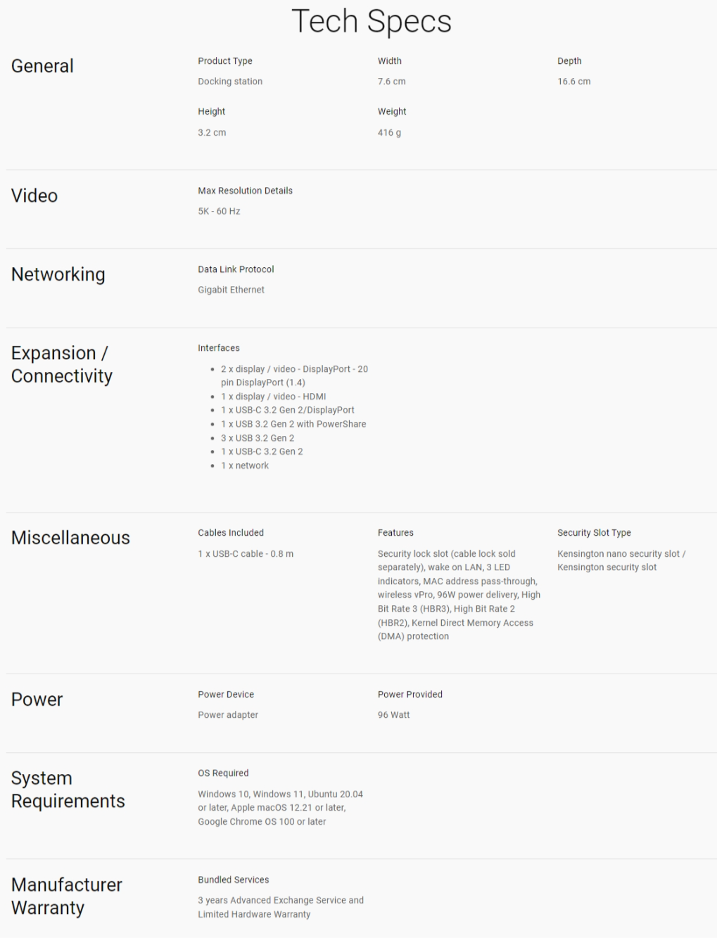 Security lock slot (cable lock sold separately), wake on LAN, 3 LED indicators, MAC address pass-through, wireless vPro, 96W power delivery, High Bit Rate 3 (HBR3), High Bit Rate 2 (HBR2), Kernel Direct Memory Access (DMA) protection