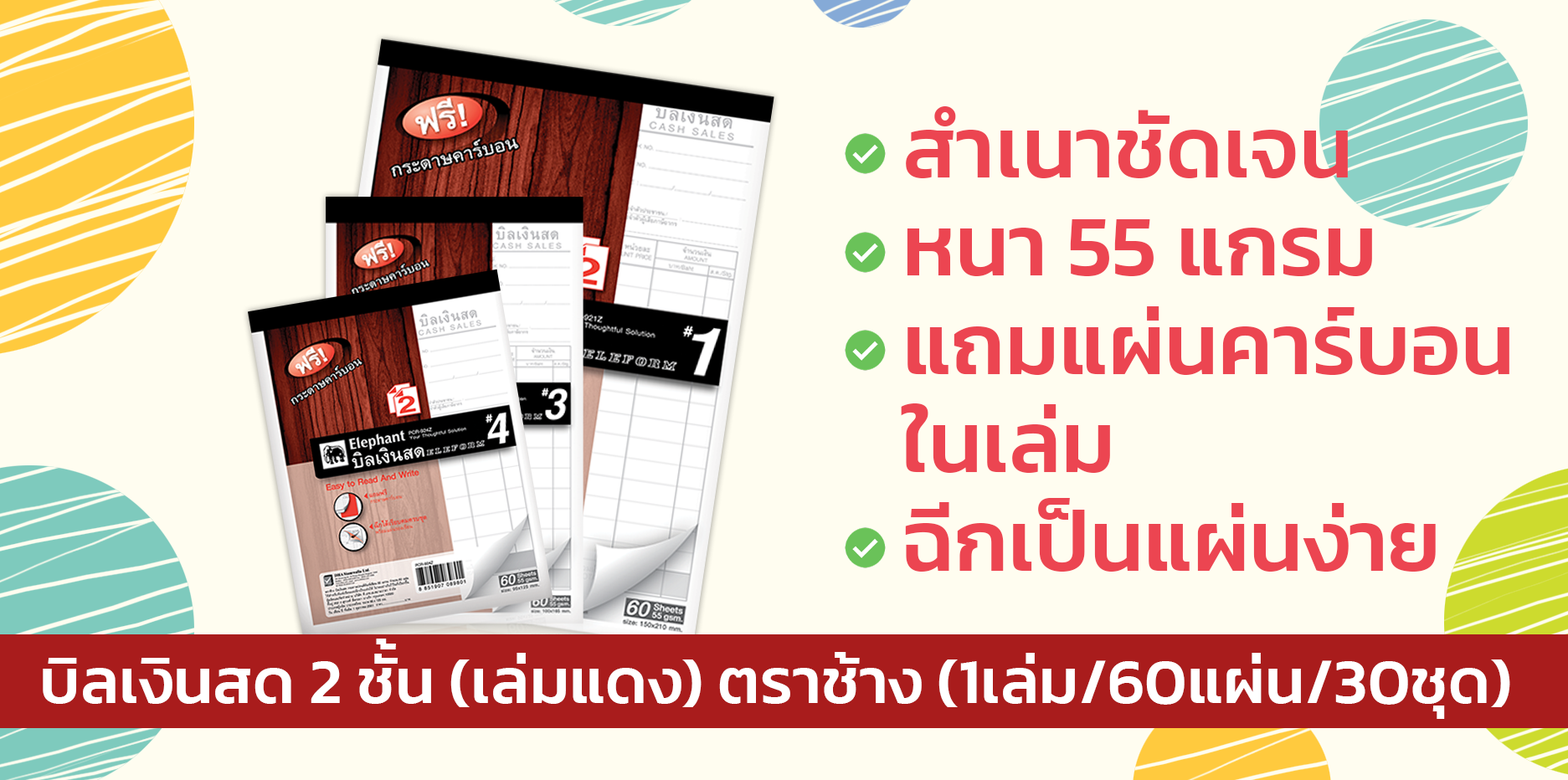สมุดบิลเงินสด ตราช้าง กระดาษบิลรุ่นนี้จะมีทั้งหมด 30 ชุด โดย 1 ชุดประกอบด้วยต้นฉบับ 1 แผ่น กับสำเนา 1 แผ่น โดยจะมีแผ่นคาร์บอนแถมมาให้กับสมุด เพื่อความสะดวกในการใช้งานมากยิ่งขึ้น บิลเงินสดรุ่นนี้จะทำให้คุณทำงานได้สะดวก แม่นยำขึ้นอย่างแน่นอน สมุดบิลเงินสดรุ่นนี้ด้านในมีลายเส้นที่คมชัด สามารถมองเห็นและใช้งานได้อย่างสะดวก พร้อมมีการเย็บเล่มแบบสันกาวที่แน่นหนา มีรอยปรุช่วยให้ฉีกได้เรียบคม