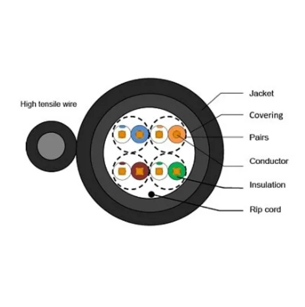 สาย LAN CAT5e + Sling 305 เมตร แบบใช้งานภายนอกอาคาร มีลวดสลิง เปลือกหุ้มสายด้านนอกวัสดุ PE ทนต่อแสงแดด, ลวดสลิงขนาด 1.1mm รองรับการเดินสายดึงไปตามเสาไฟหรือระหว่างอาคาร สายภายในเป็นลวดทองแดงขนาดตัวนำไฟฟ้า 23AWG สายบิดเกลียวไม่มีเปลือกหุ้ม บรรจุภายในกล่องแบบ Roll สะดวกต่อการดึงสายมาใช้งาน
