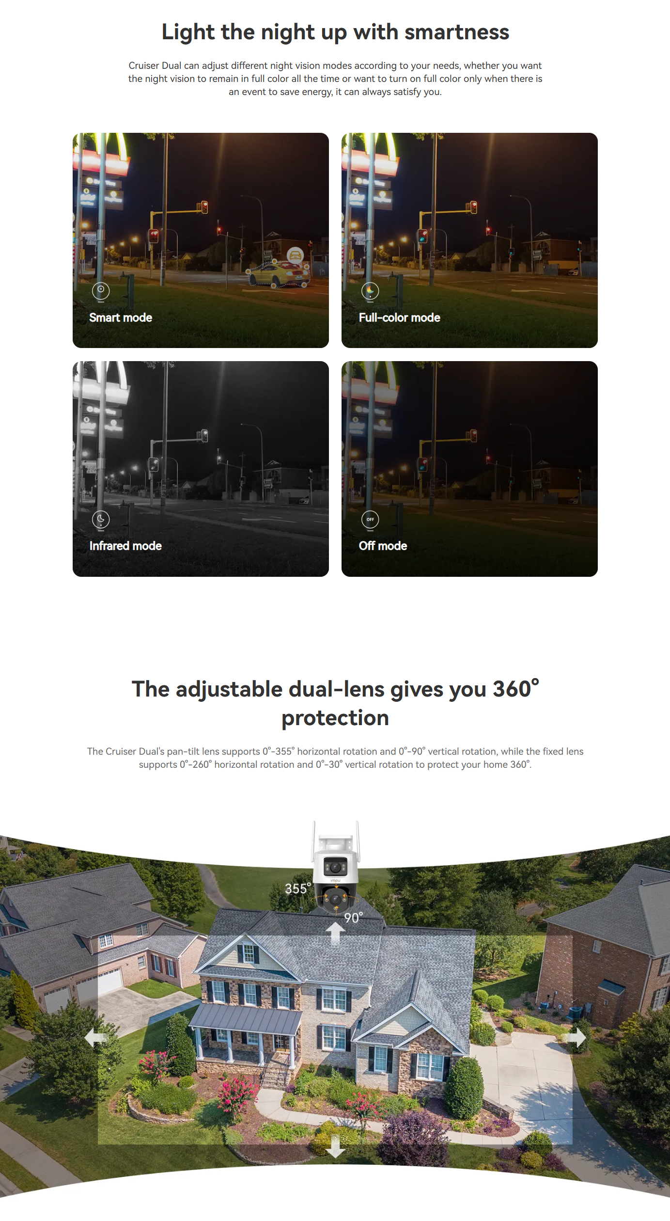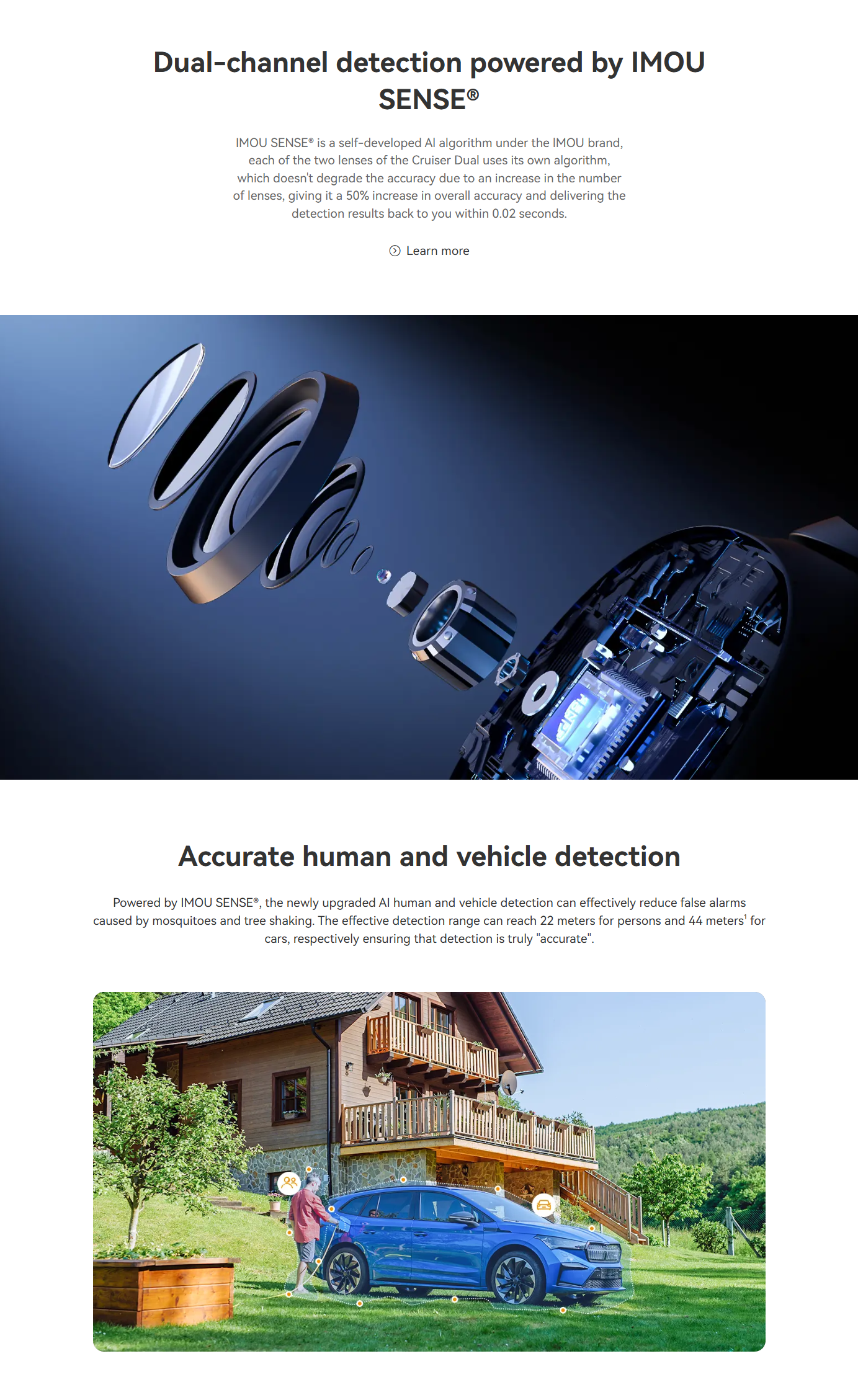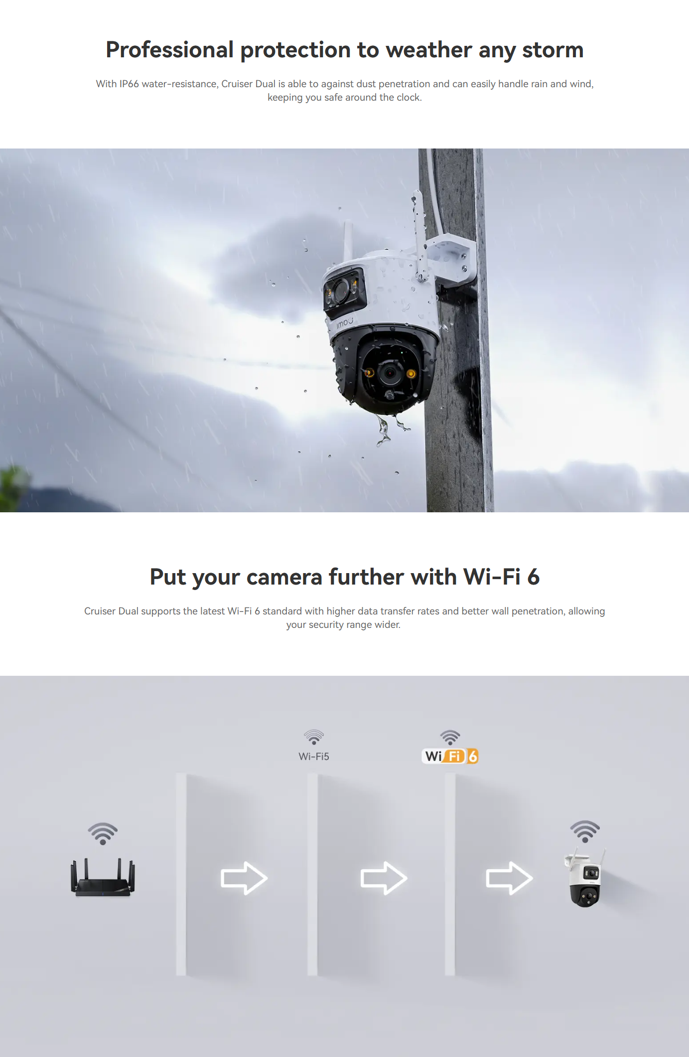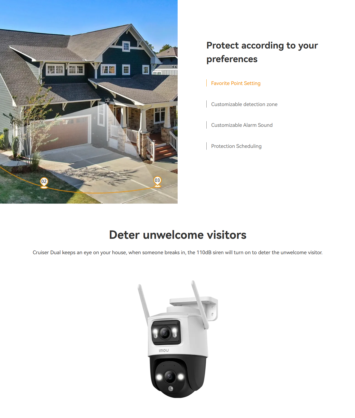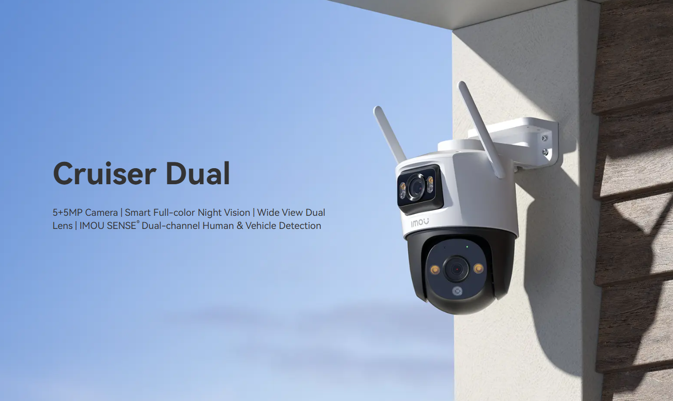 📌 Cruiser Dual 10MP have two lens(5MP Fixed lens and 5MP PT lens), two lenses can independently monitor scenes from different angles, Makes one Cruiser Dual worth 2 traditional monocular cameras. Fixed Lens supports manual angle adjustment within the range of 0~260° pan & 0~30°tilt ;PT Lens supports motorized angle adjustment from 0~355° pan & 0~90°tilt;Cruiser Dual ensures every corner of your home completely covered. It supports four night vision modes for clear-as day clarity even in pitch dark. With IP66 certified, the camera can be used outdoors under different weather conditions. With built-in spotlight and security siren, Cruiser Dual enables high-quality two-way talk;It also supports IMOU’s self-developed algorithm (IMOU SENSE), which supports human detection and vehicle detection, greatly reducing the rate of false alarms while bringing better protection to home security