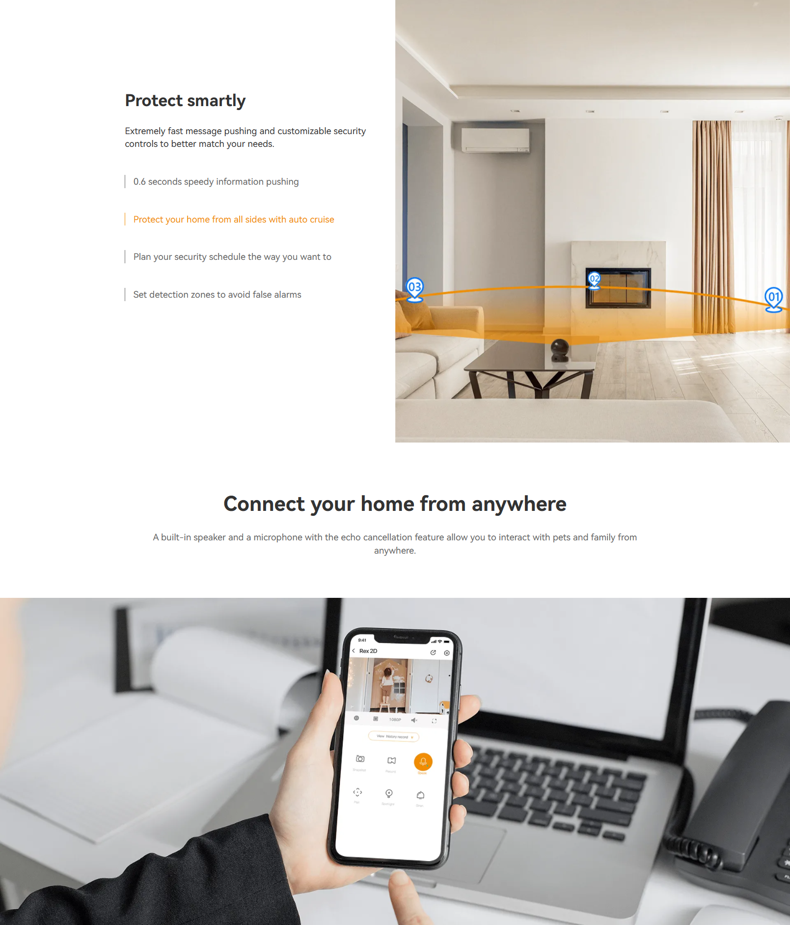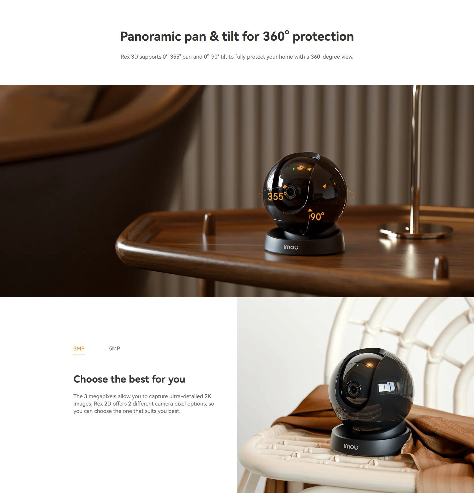 Rex 3D supports 0°-355° pan and 0°-90° tilt to fully protect your home with a 360-degree view.