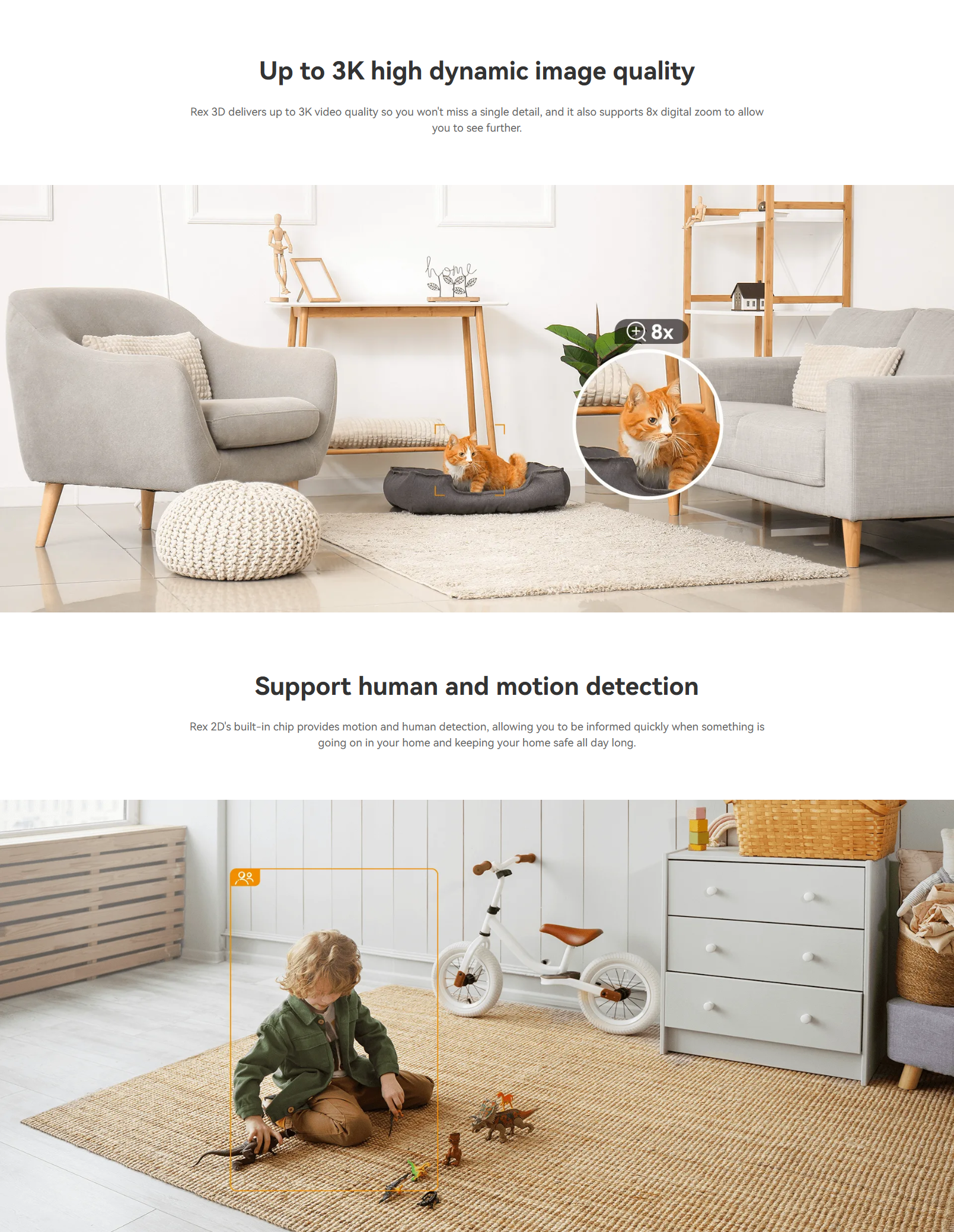 Rex 2D’s built-in chip provides motion and human detection, allowing you to be informed quickly when something is going on in your home and keeping your home safe all day long.