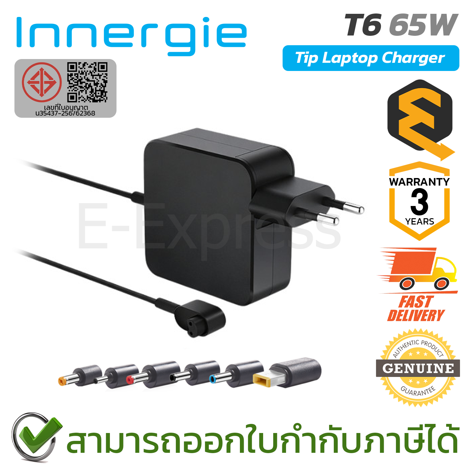 Innergie T6 Power Adapter For 65W ใช้ได้กับ Acer, Asus, Dell, HP, Lenovo อะแดปเตอร์ชาร์จไฟ ของแท้ ประกันศูนย์ 3ปี