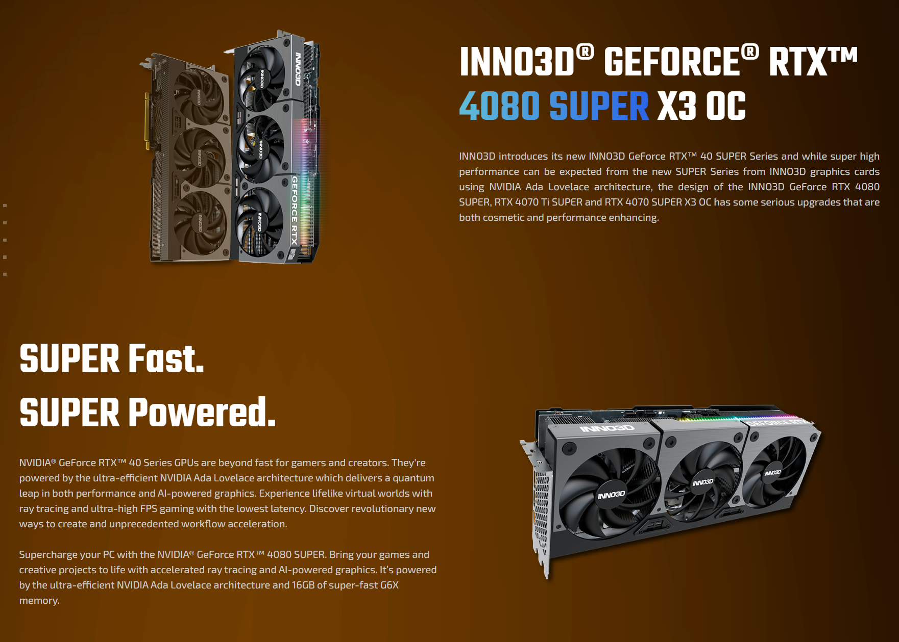 INNO3D introduces its new INNO3D GeForce RTX™ 40 SUPER Series and while super high performance can be expected from the new SUPER Series from INNO3D graphics cards using NVIDIA Ada Lovelace architecture, the design of the INNO3D GeForce RTX 4080 SUPER, RTX 4070 Ti SUPER and RTX 4070 SUPER X3 OC has some serious upgrades that are both cosmetic and performance enhancing.