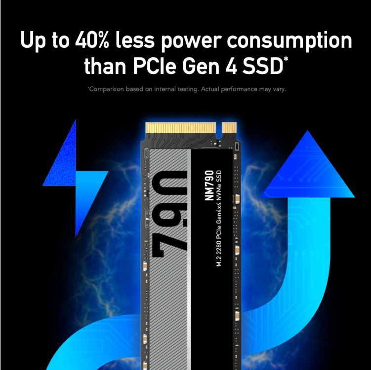 Consuming up to 40% less power consumption than DRAM cache-enabled PCIe Gen 4 SSDs2, Lexar® NM790 M.2 2280 PCIe Gen 4×4 NVMe SSD not only keeps energy costs down, but also lets you go longer between charges of your laptop battery.