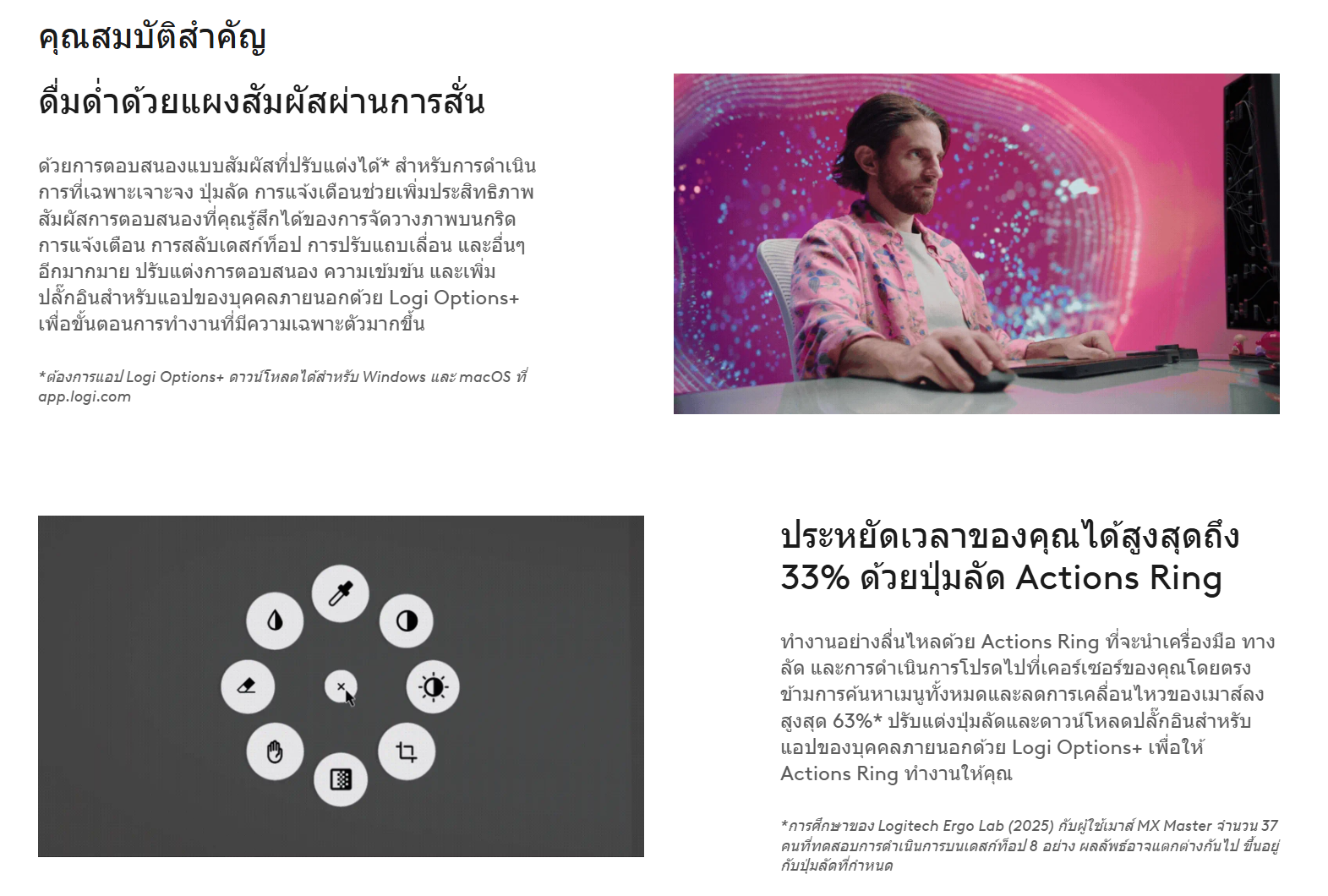 🔻 การตอบสนองแบบสัมผัสได้รับการรองรับสำหรับฟีเจอร์หลักของ Options+ เช่น Actions Ring, Smart Actions, Gestures