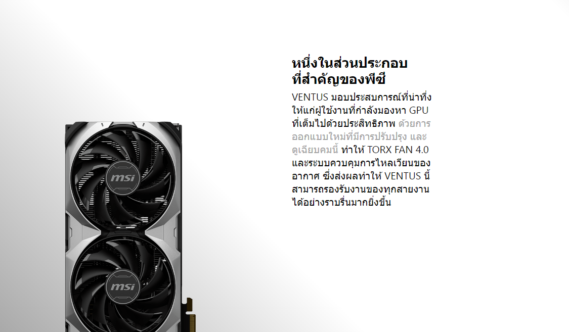 ที่สำคัญของพีซีVENTUS มอบประสบการณ์ที่น่าทึ่งให้แก่ผู้ใช้งานที่กำลังมองหา GPUที่เต็มไปด้วยประสิทธิภาพ ด้วยการออกแบบใหม่ที่มีการปรับปรุง และดูเฉียบคมนี้ ทำให้ TORX FAN 4.0และระบบควบคุมการไหลเวียนของอากาศ ซึ่งส่งผลทำให้ VENTUS นี้ สามารถรองรับงานของทุกสายงานได้อย่างราบรื่นมากยิ่งขึ้น
