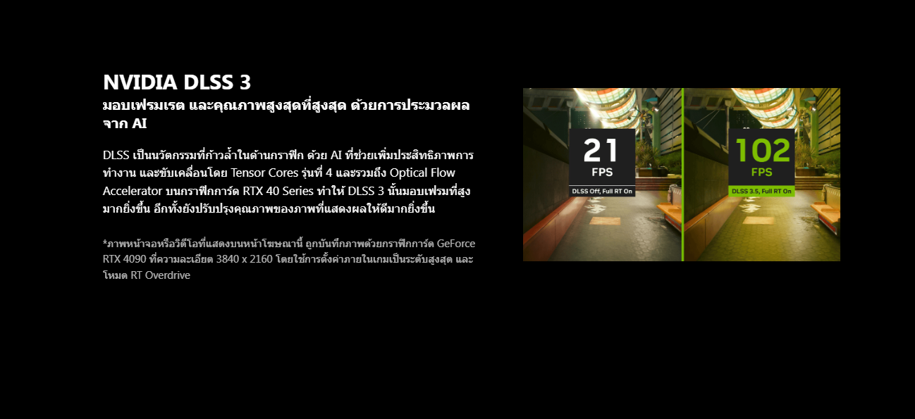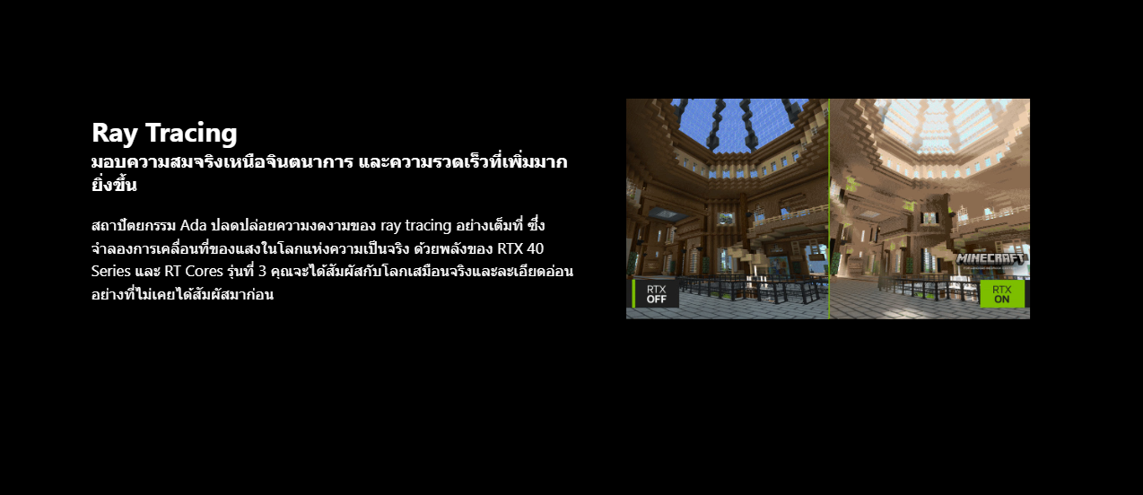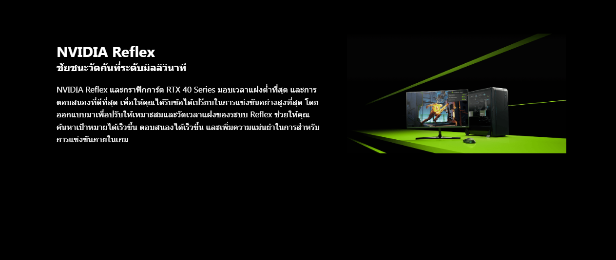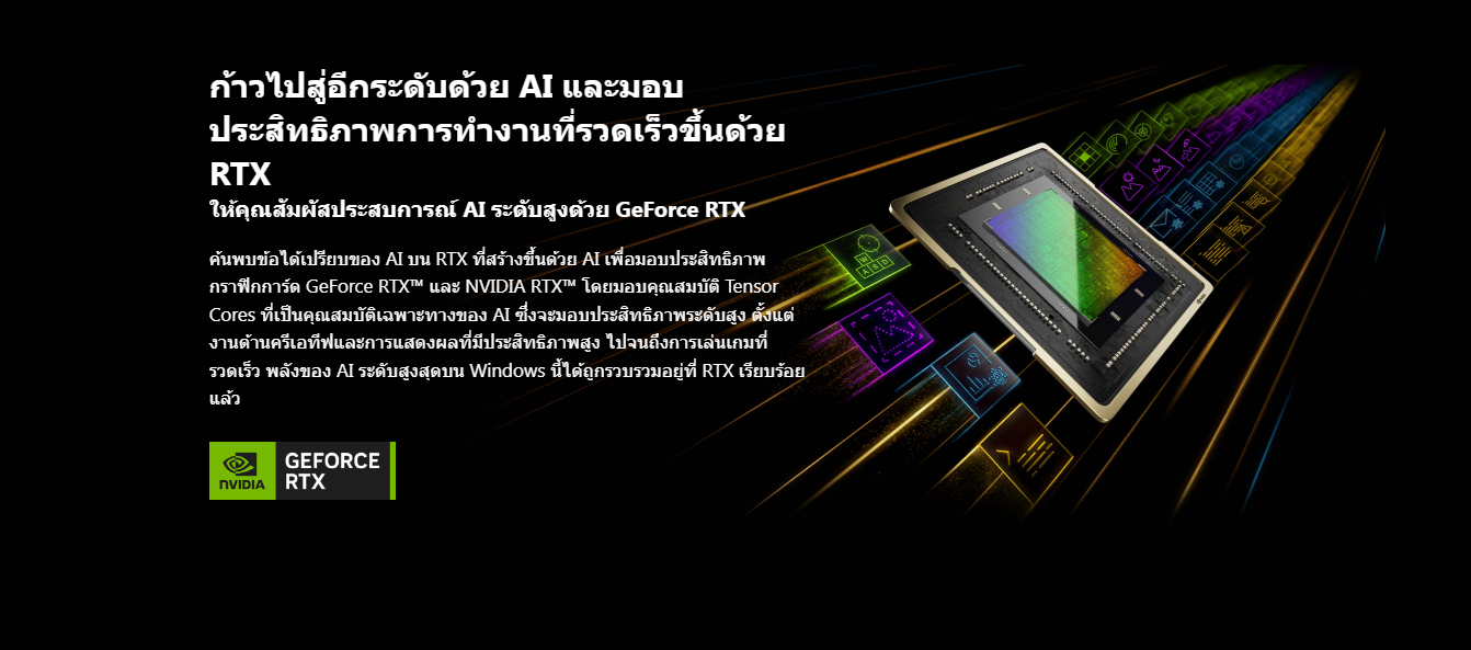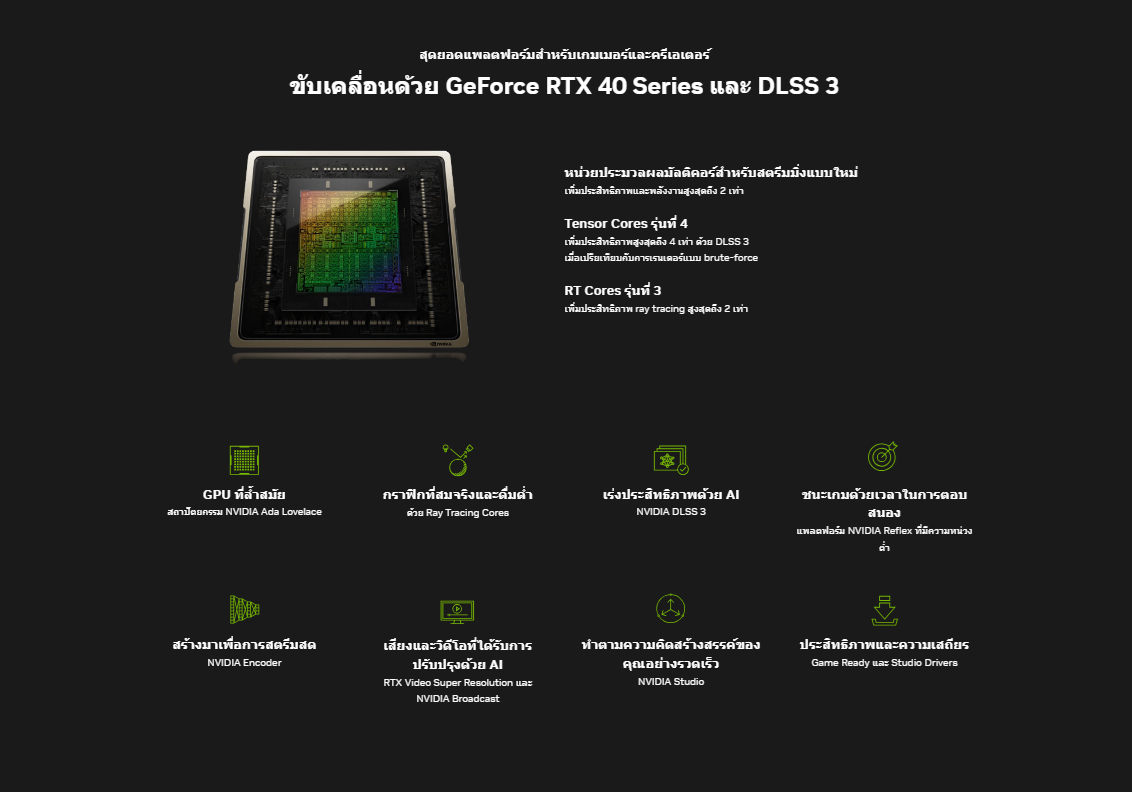 การเล่นเกมที่ใหม่ล่าสุดด้วยสถาปัตยกรรม NVIDIA Ada Lovelace ที่มีประสิทธิภาพสูง ให้คุณสัมผัสประสบการณ์การเล่นเกมที่สมจริงและเต็มไปด้วยประสิทธิภาพจาก AI ด้วยการทำงานของ Ray Tracing และ DLSS 3 นอกจากนั้นยังสามารถช่วยเพิ่มประสิทธิภาพให้กับกระบวนการออกแบบและสร้างสรรค์ อีกทั้งยังช่วยให้การทํางานของคุณนั้นมีประสิทธิภาพที่ดีมากขึ้นด้วย NVIDIA Studio
