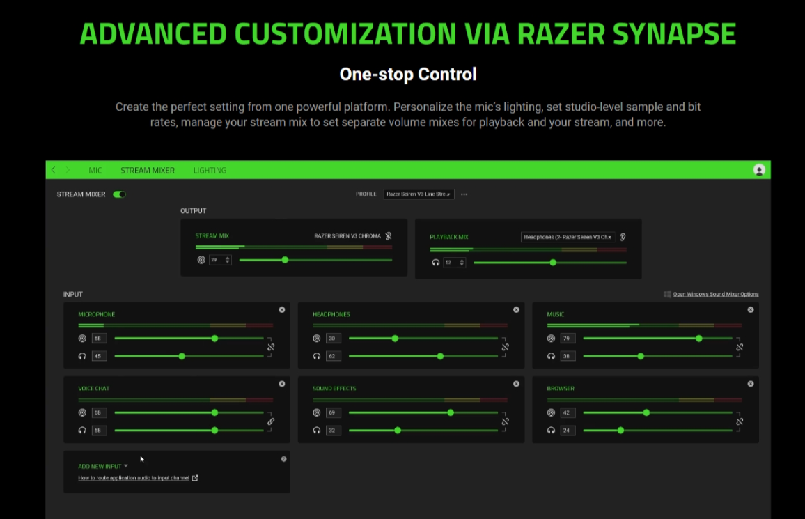 Create the perfect setting from one powerful platform. Personalize the mic’s lighting, set studio-level sample and bit rates, manage your stream mix to set separate volume mixes for playback and your stream, and more.