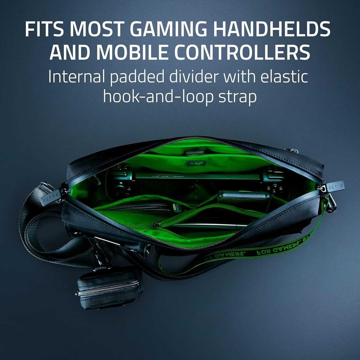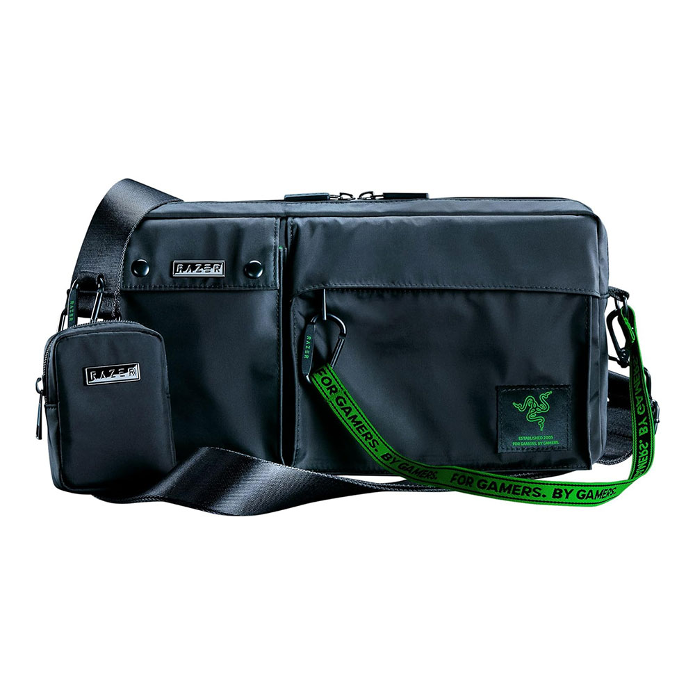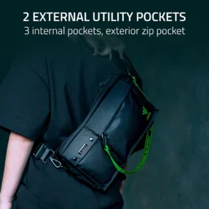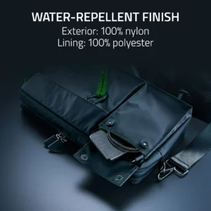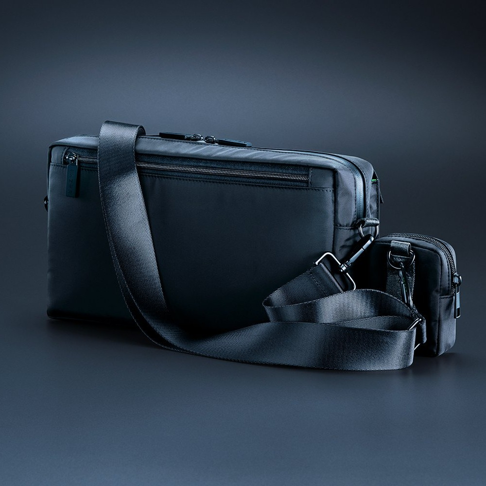 🔹 Engraved Razer-branded metal tag on pocket flap and mini pouch