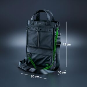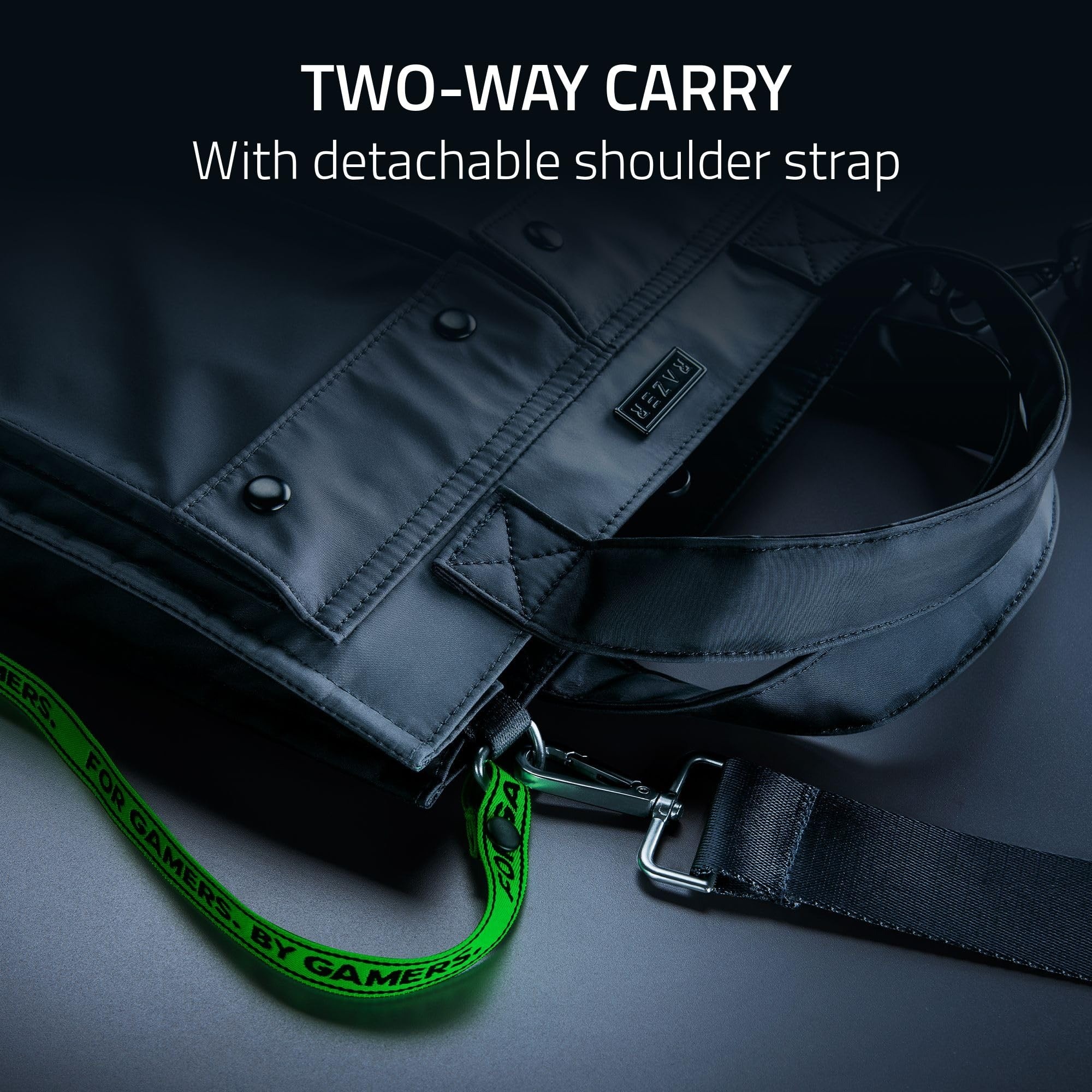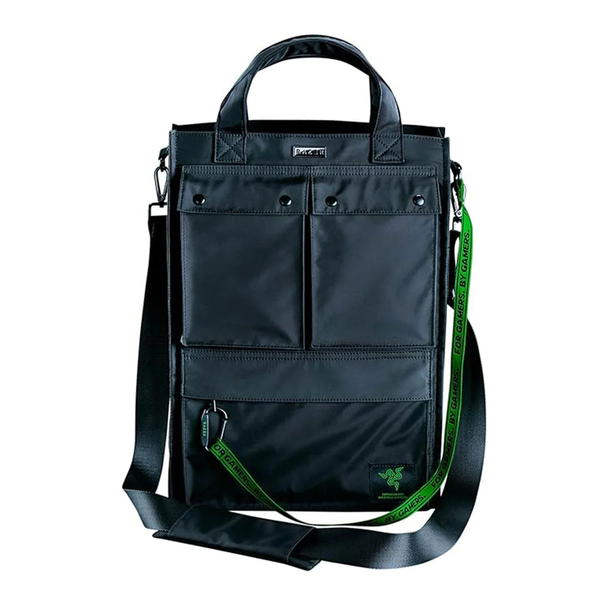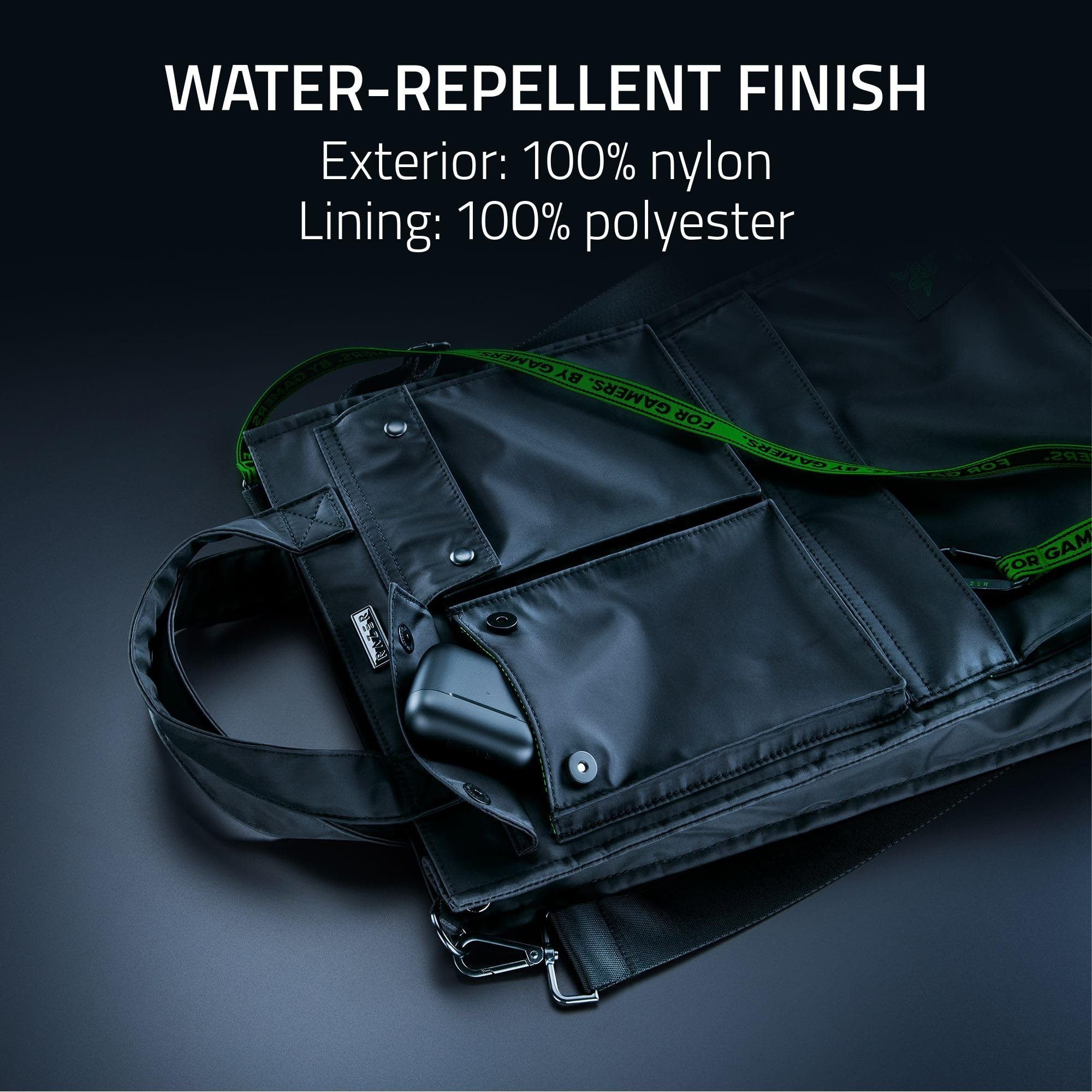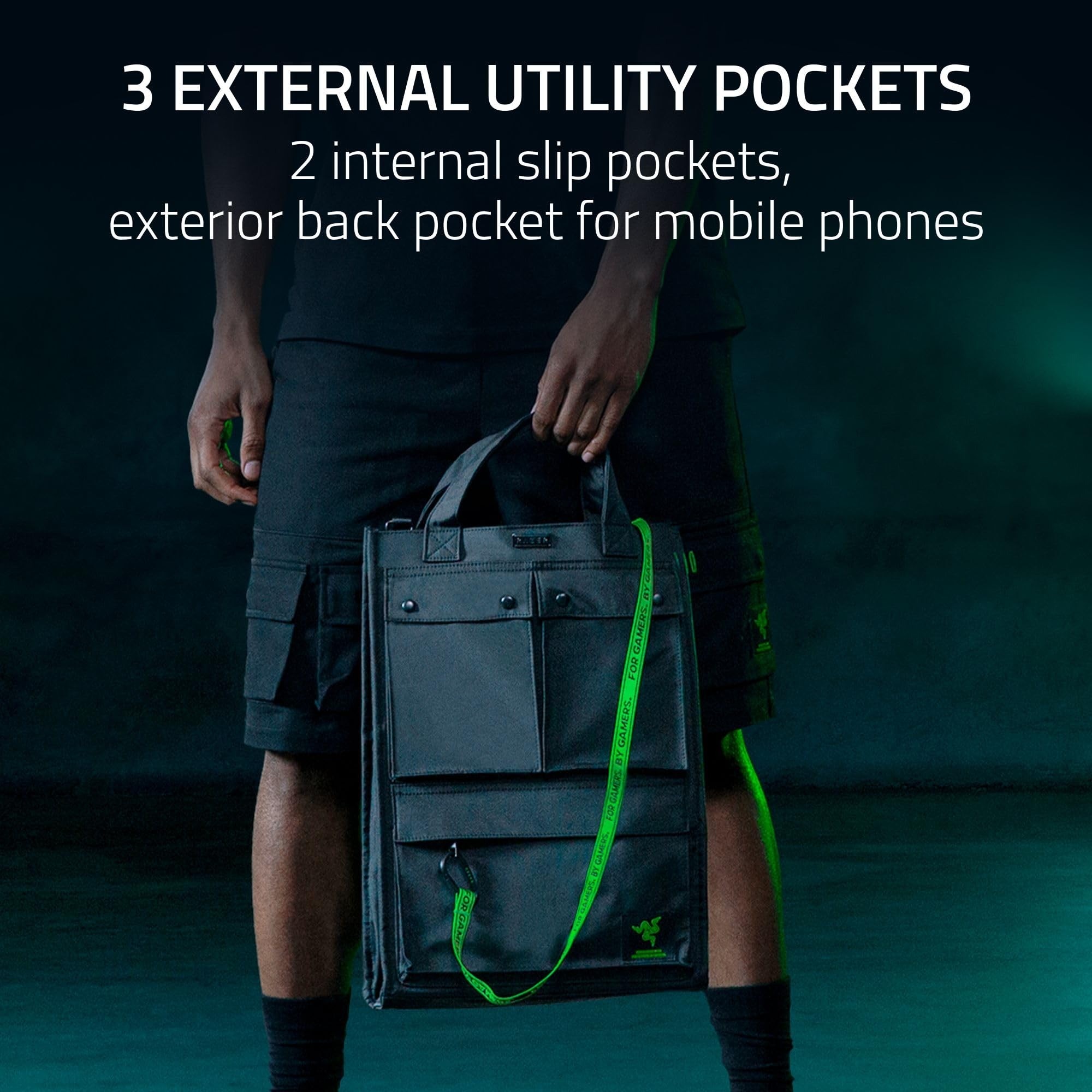 🔻 Engraved Razer-branded metal tag along top edge of front of bag