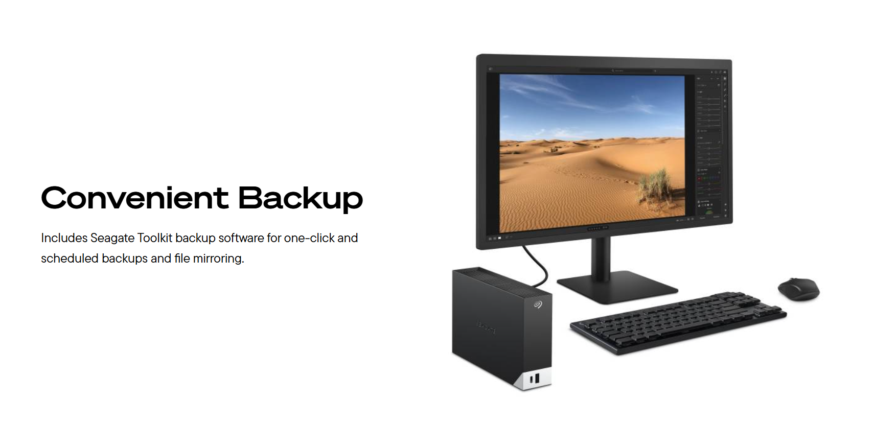 Includes Seagate Toolkit backup software for one-click and scheduled backups and file mirroring.