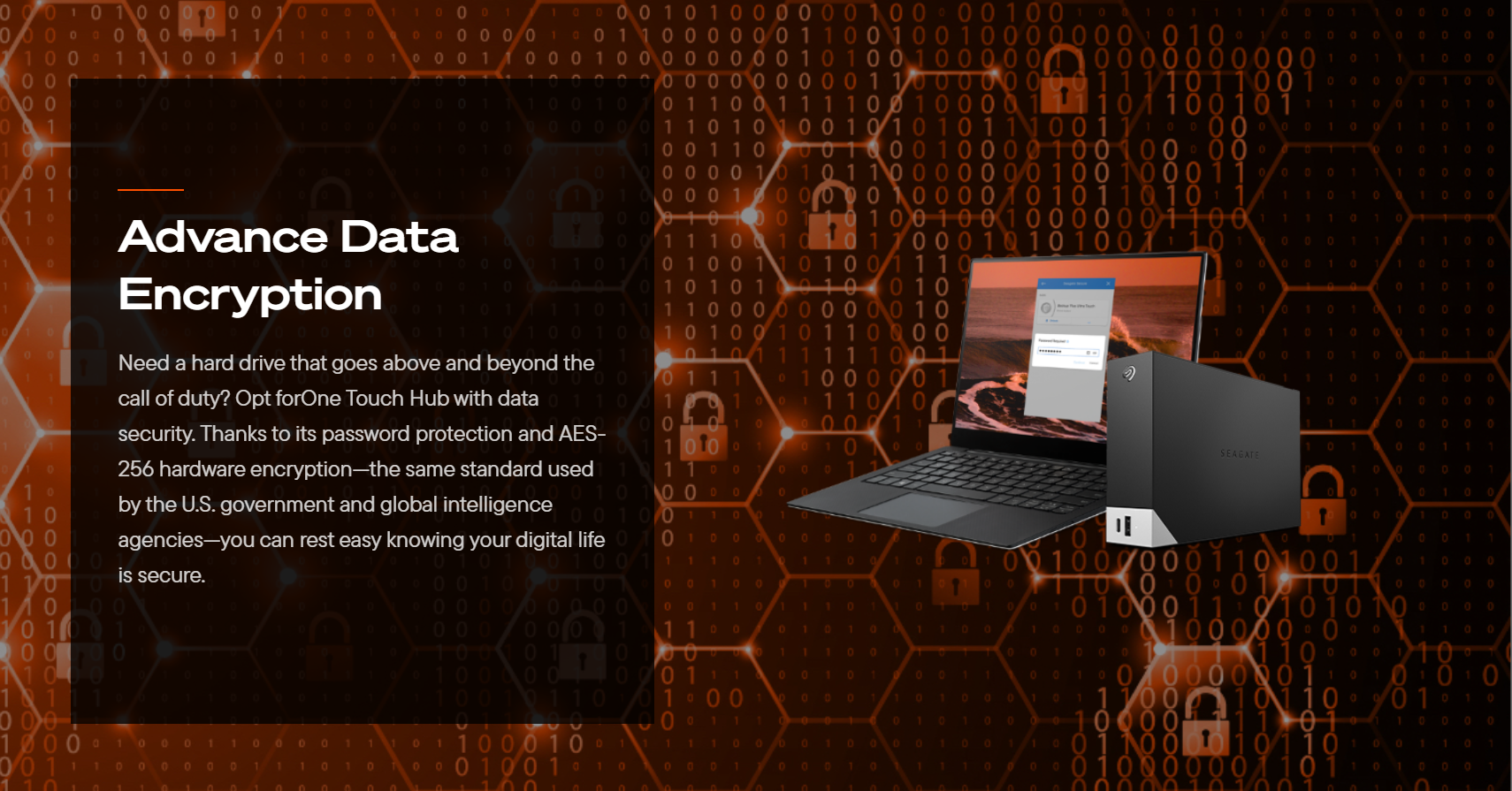 Need a hard drive that goes above and beyond the call of duty? Opt forOne Touch Hub with data security. Thanks to its password protection and AES-256 hardware encryption—the same standard used by the U.S. government and global intelligence agencies—you can rest easy knowing your digital life is secure.