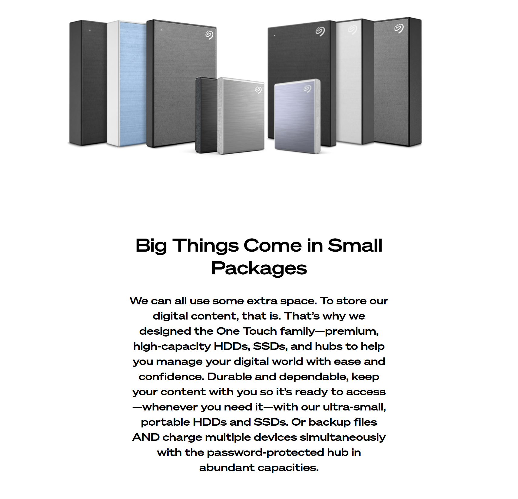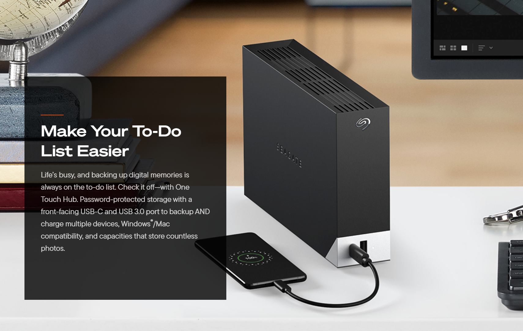 Life’s busy, and backing up digital memories is always on the to-do list. Check it off—with One Touch Hub. Password-protected storage with a front-facing USB-C and USB 3.0 port to backup AND charge multiple devices, Windows®/Mac compatibility, and capacities that store countless photos.