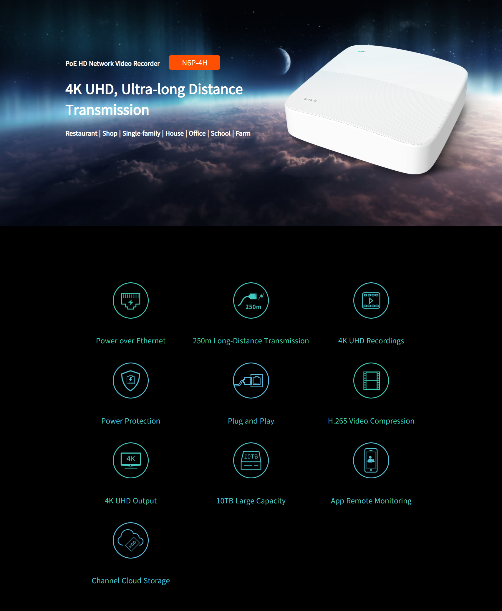Power supply and network transmission can be realized with only one Ethernet cable that supports 250 m long-distance transmission, which requires no switch, power adapter or PoE relay. This greatly simplifies the networking.