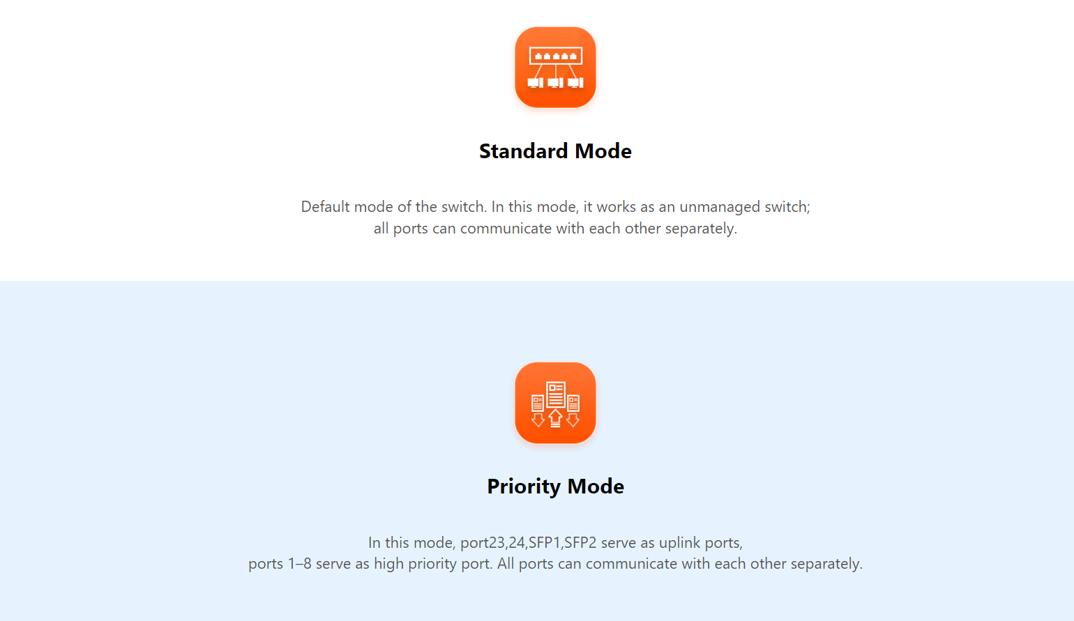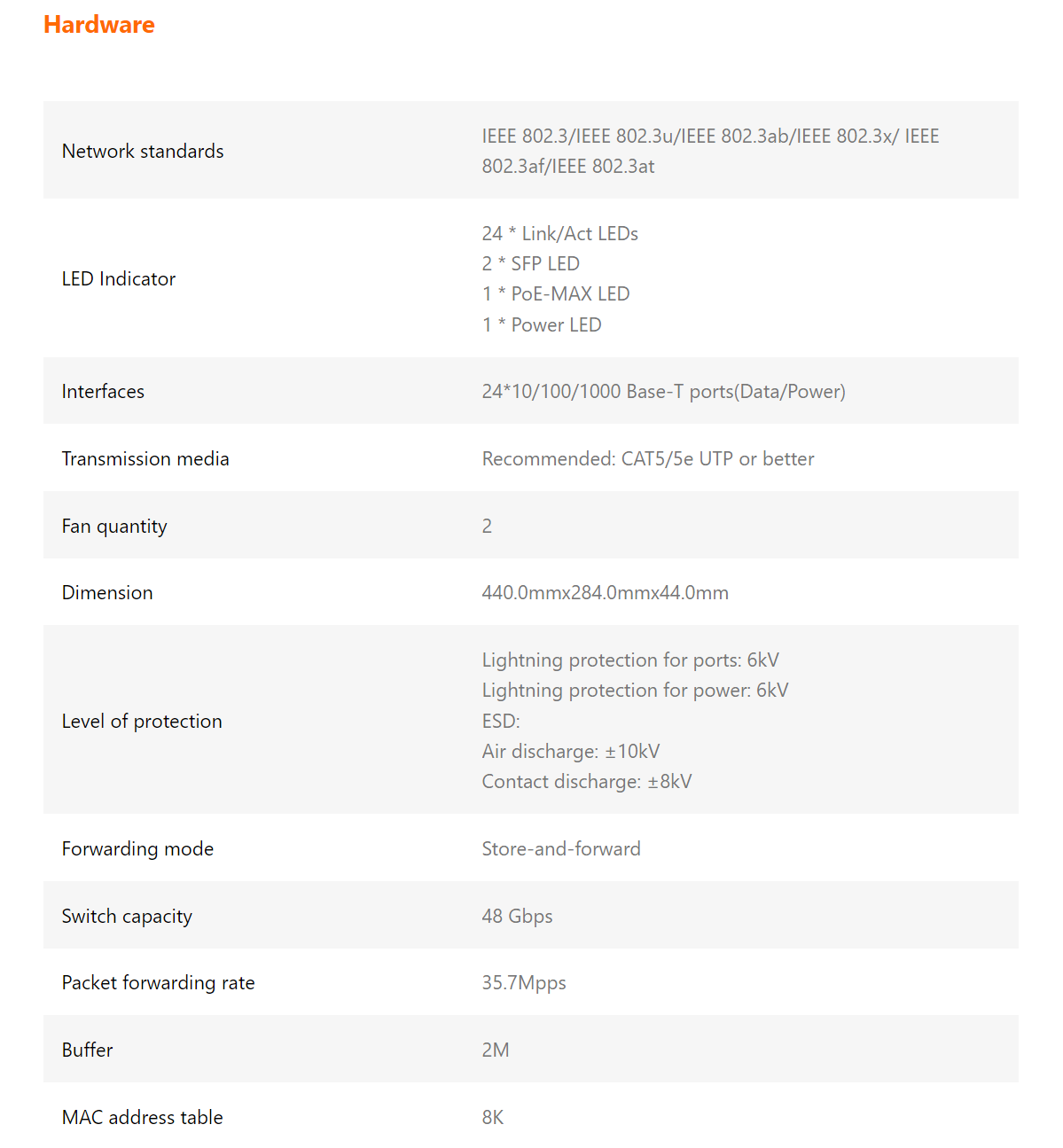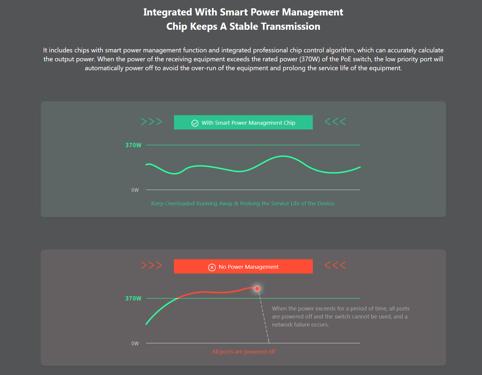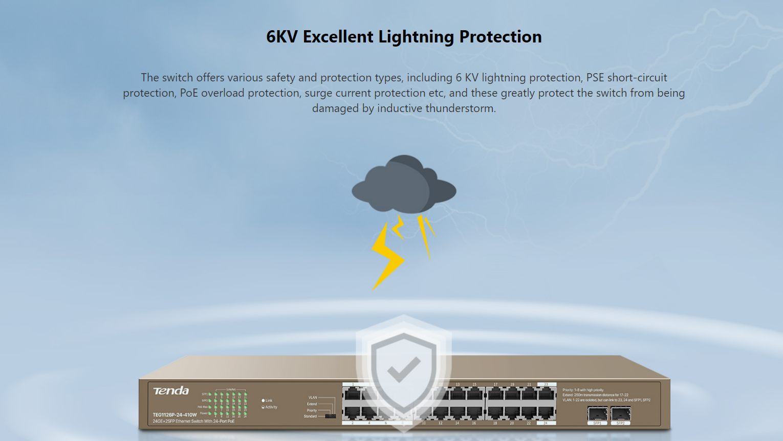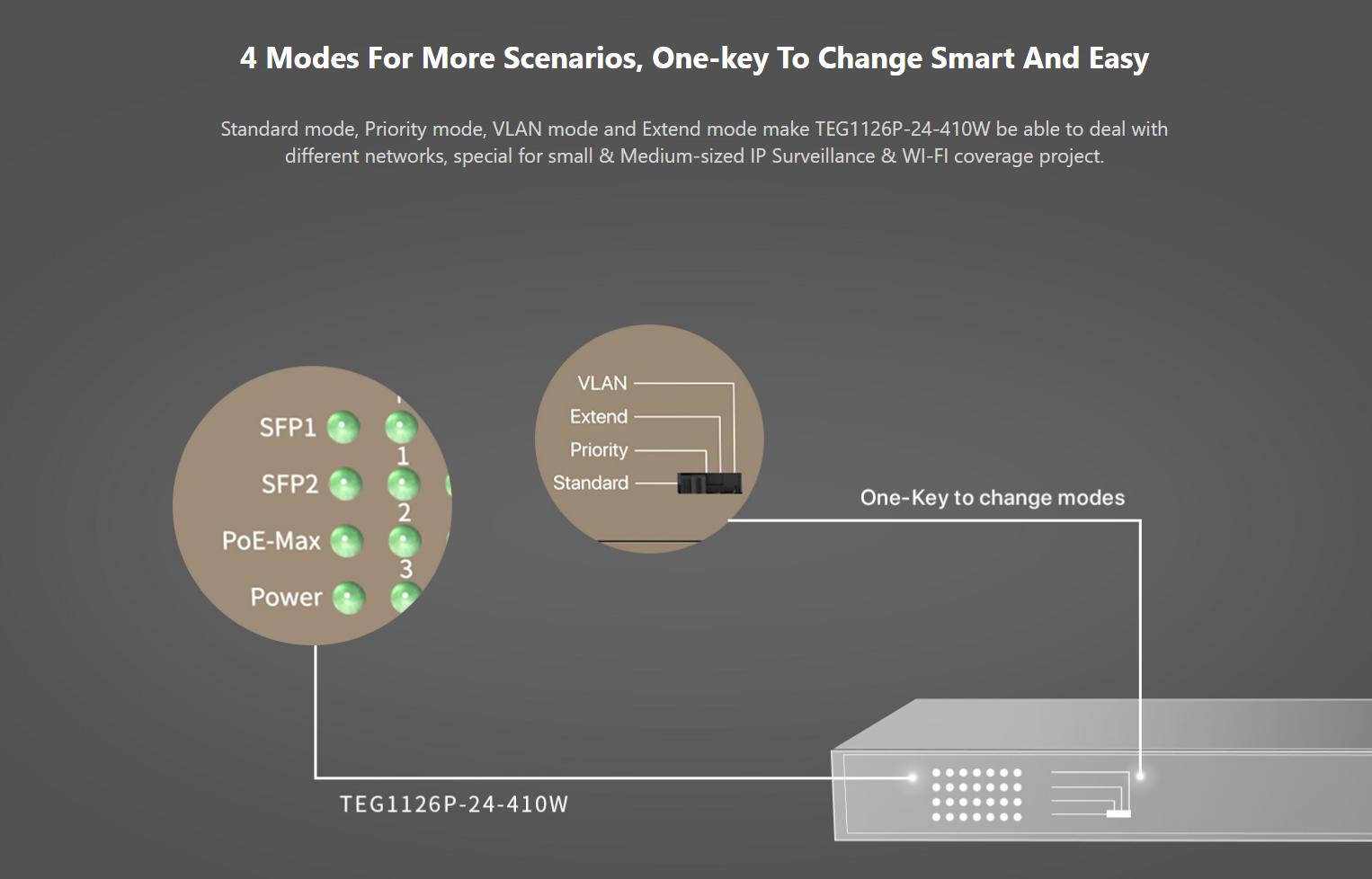 TEG1126P-24-410W is a unmanaged PoE switch independently designed by Tenda. Compliant with IEEE 802.3af and IEEE 802.3at standards, it can identify PoE-powered devices intelligently. With a maximum PoE power output of 370W, and 30W for a single port, it can supply power when transmitting data with APs, IP cameras, and IP phones. The switch supports 4 working modes, including standard, priority, extend and VLAN modes, is an ideal choice for SMBs, hotels, schools, factories with video surveillance and wireless networking requirements.