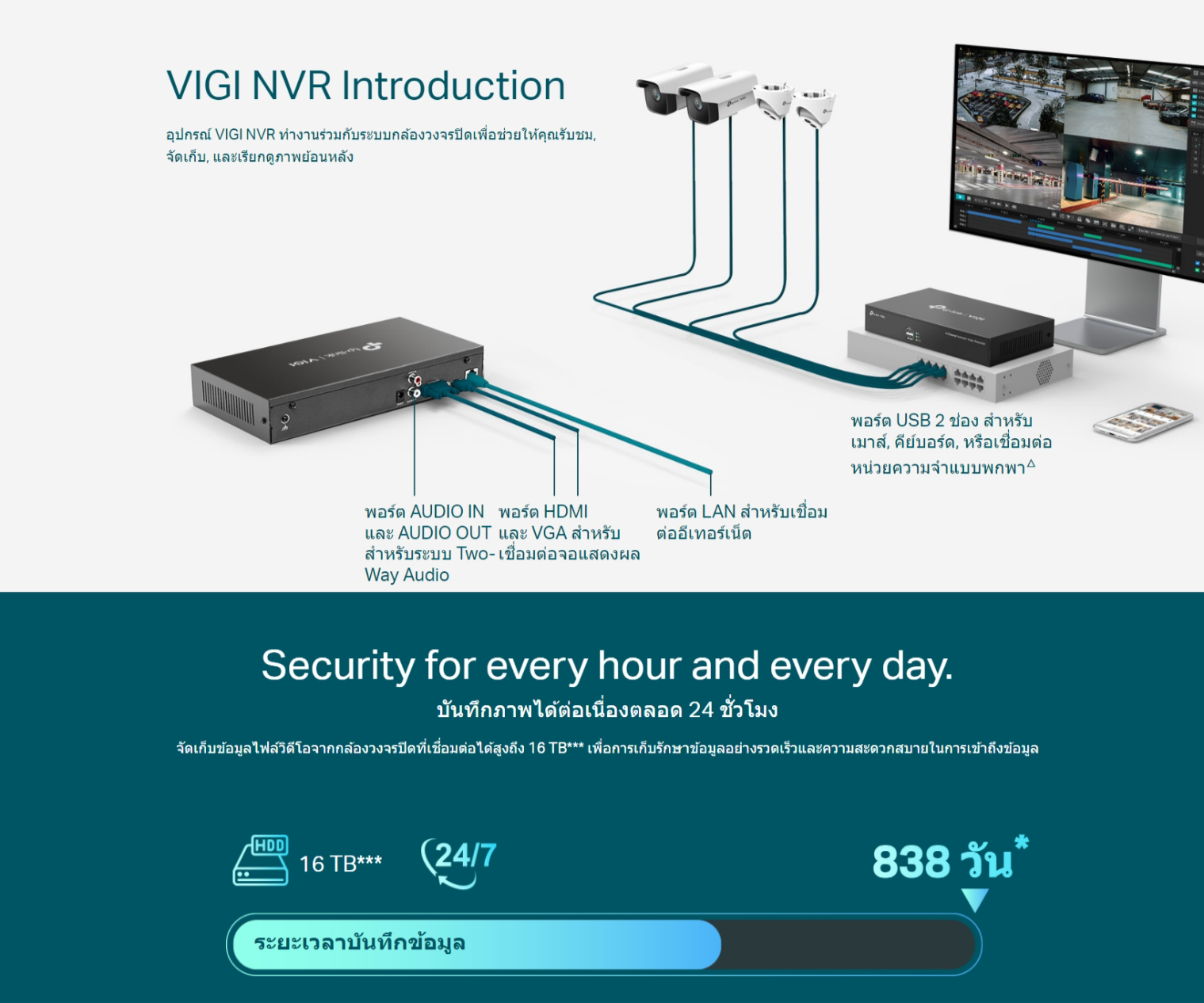 ✅ 1 HDD Interface (up to 16 TB)△: รองรับการจัดเก็บข้อมูลได้สูงถึง 16 TB*** (บันทึกวิดีโอยาวนาน 838 วัน*) บนฮาร์ดดิสก์ SATA ให้ข้อมูลสำคัญปลอดภัยอยู่กับคุณเสมอ