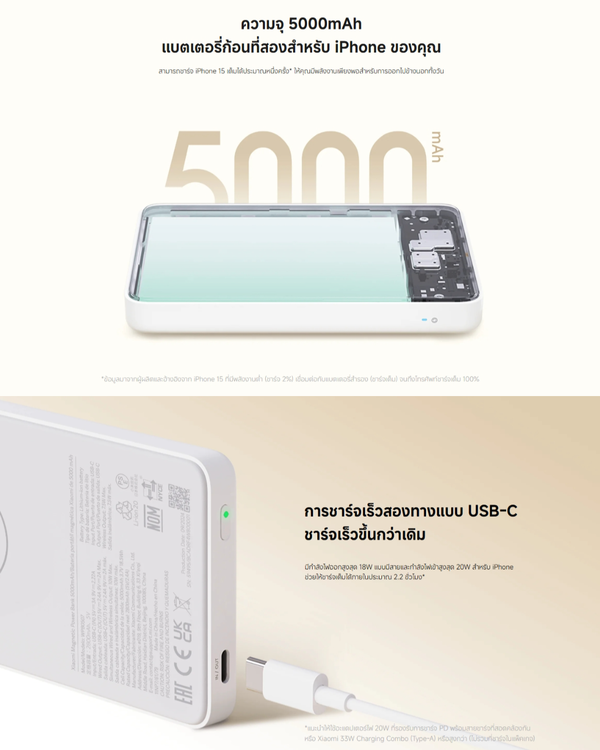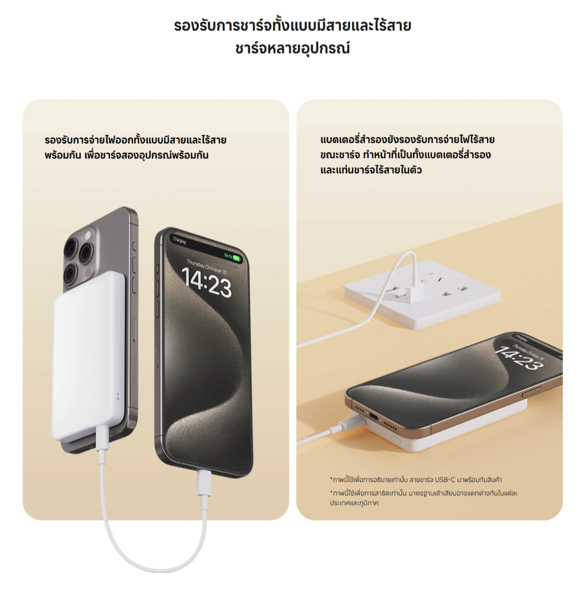 มีกำลังไฟออกสูงสุด 18W แบบมีสายและกำลังไฟเข้าสูงสุด 20W สำหรับ iPhone ช่วยให้ชาร์จเต็มได้ภายในประมาณ 2.2 ชั่วโมง*