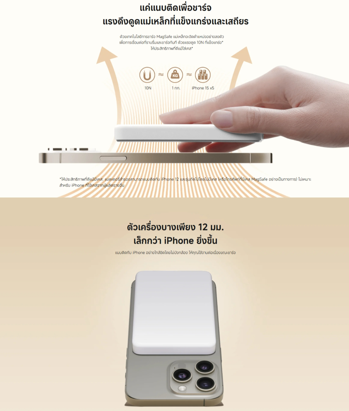 ด้วยเทคโนโลยีการชาร์จ MagSafe แม่เหล็กจะจัดตำแหน่งอย่างลงตัวเพื่อการเชื่อมต่อที่ราบรื่นและชาร์จทันที ด้วยแรงดูด 10N ที่แข็งแกร่ง* ให้ประสิทธิภาพที่ดีแม้ใส่เคส*